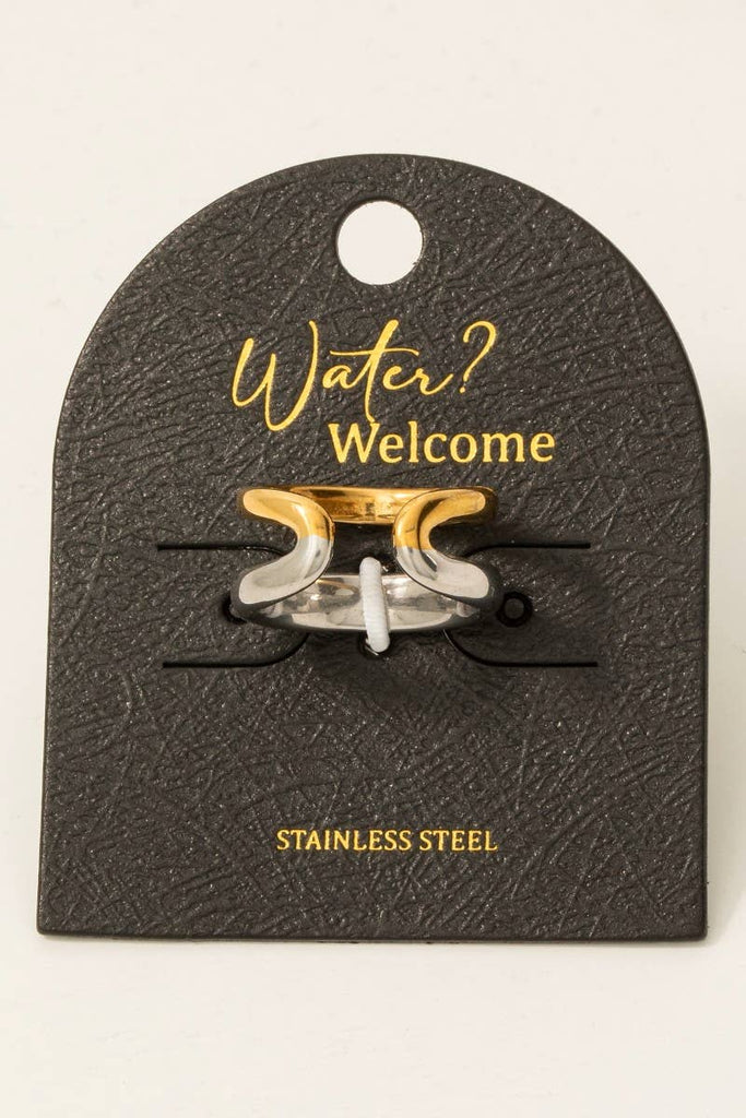 This ring features a fashionable stainless steel two tone layered open band style. Indulge in the allure of exquisite craftsmanship as this ring effortlessly adds a touch of luxury to your attire. SIZE 6.5 100% STAINLESS STEEL