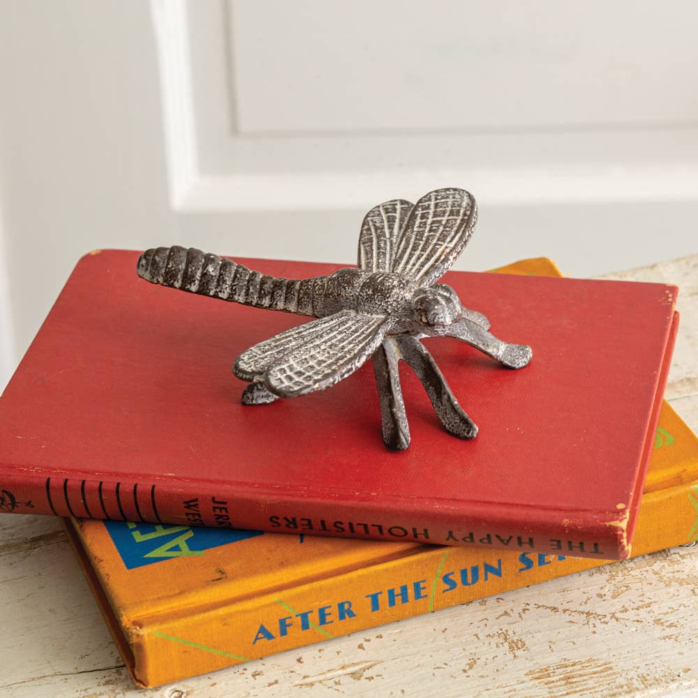 Sit this figurine on a small end table for a little whimsy and charm. This dragonfly figurine is made of cast iron.