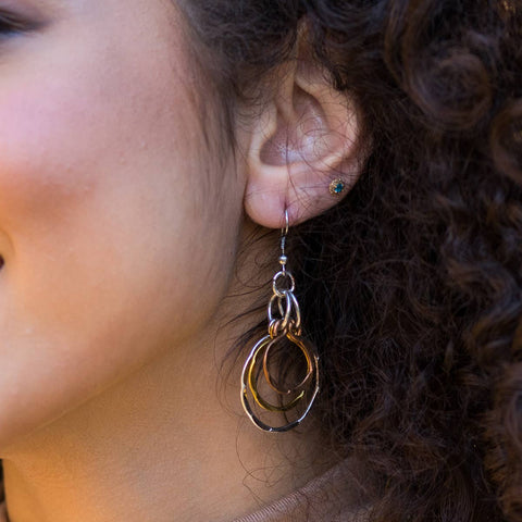 These earrings feature a trio of nested, open hoops linked together. Each hoop is crafted in a different metallic tone—antique silver, antique brass, and antique copper—with the largest hoop showcasing a hand-hammered texture. The entire piece is sealed with a protective lacquer to prevent tarnish.